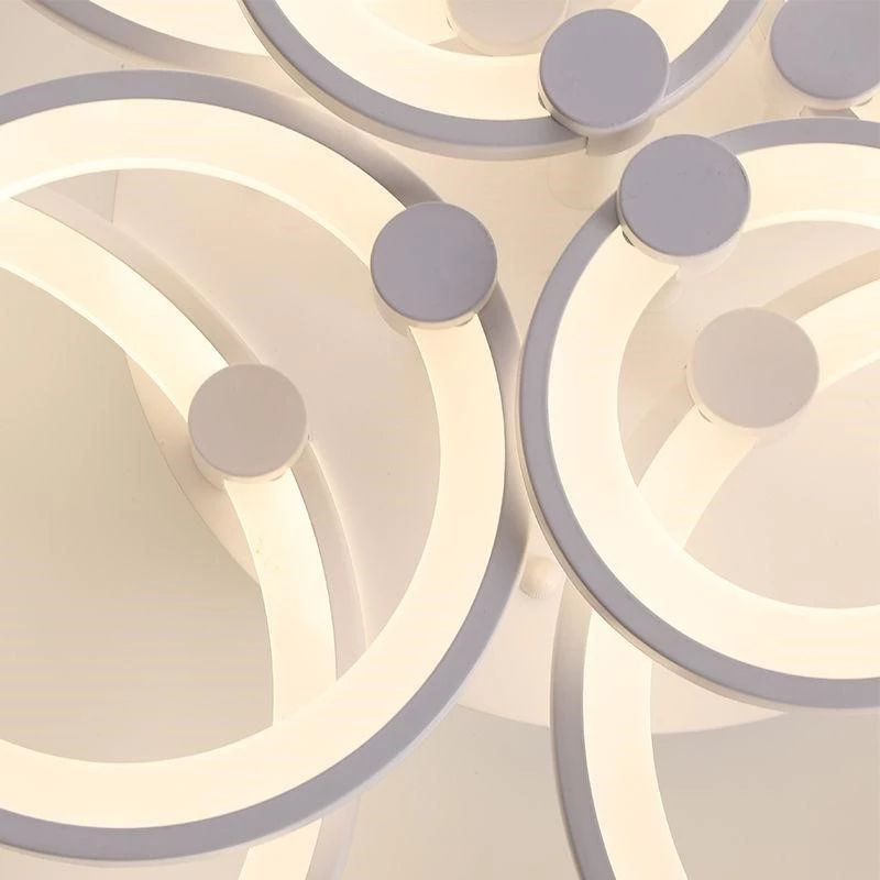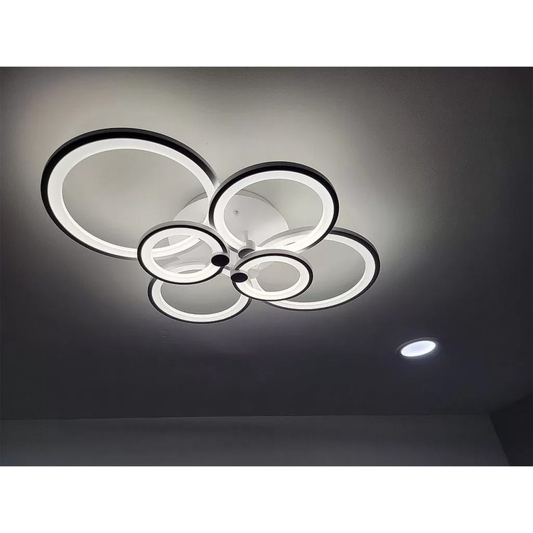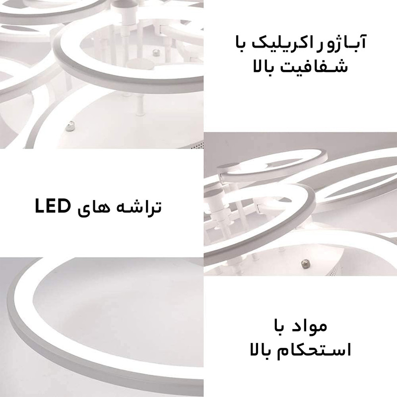 این مدل لوستر شش حلقه ،با قطرهای 30،40و20 می باشد ،که با بدنه سفید ارائه شده ، و در سه رنگ نور ،آفتابی و مهتابی و همزمان هردو (چند رنگ ) قابل انتخاب می باشد. ارتفاع لوستر از 15 سانتیمتر و مناسب فضاهای با ارتفاع کم می باشد.