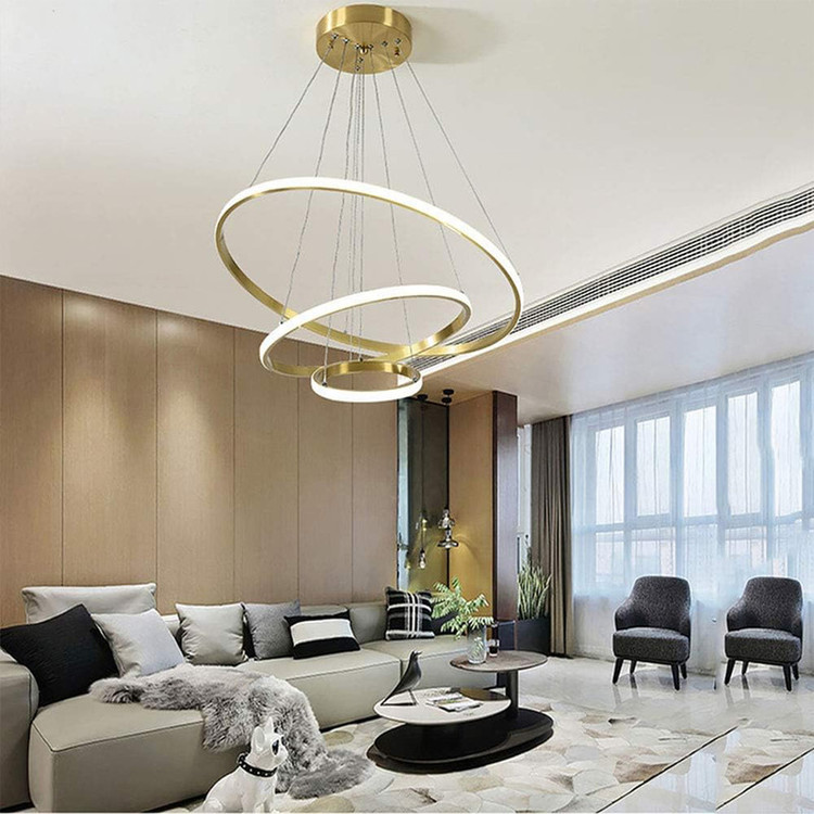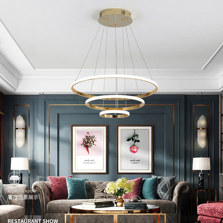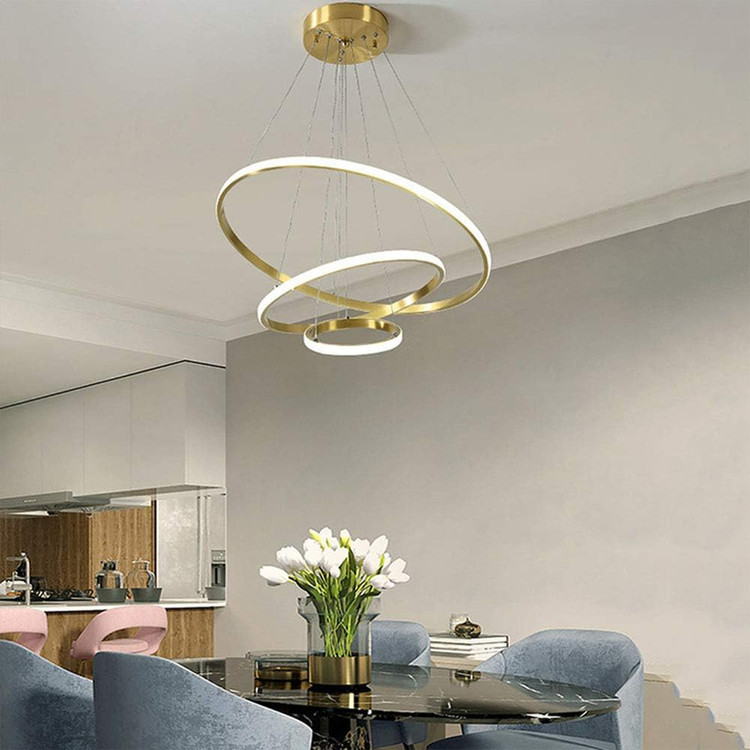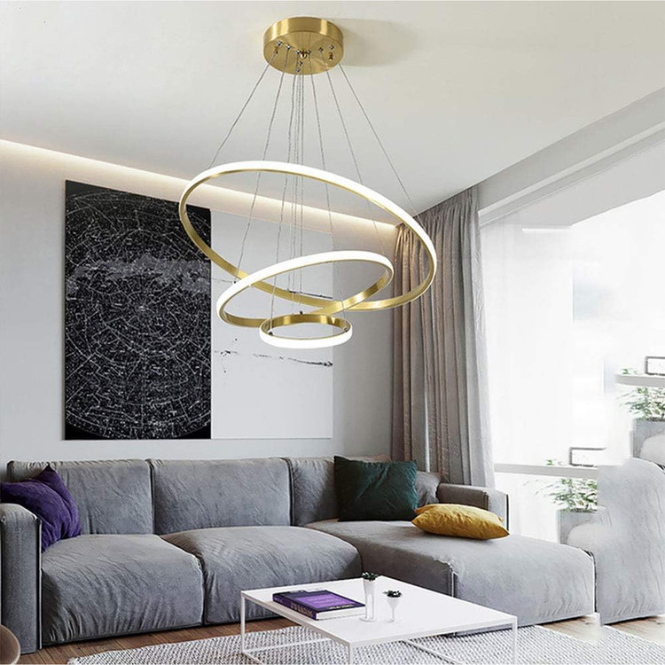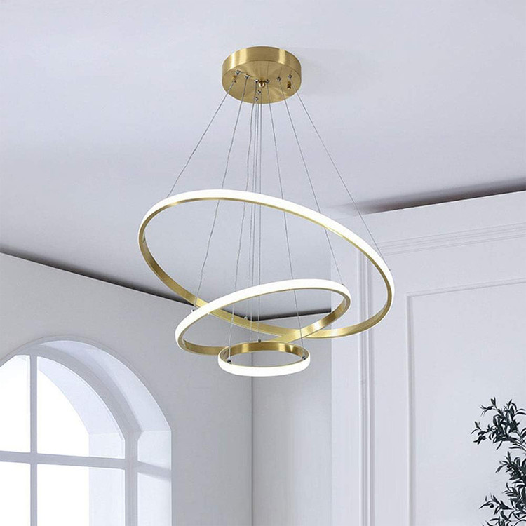 لوستر سه حلقه سقفی به ابعاد 70-50-30 سانتیمتر ،رنگ بدنه طلایی آبکاری ،در سه نوع (آفتابی ،مهتابی و چند رنگ) ارائه میشود ،از امکانات ریموت می توان کم و زیاد کردن نور ،حالت شب ، اپلیکیشن موبایل (کم و زیاد کردن نور ،تغییر طیف نوری ،تنظیم زمان برای خاموش یا روشن شدن ) ارائه میشود.