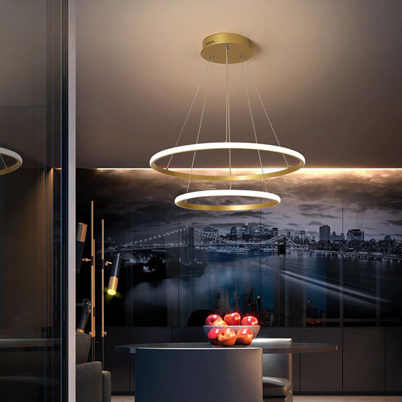 لوستر دو حلقه دایره به ابعاد 35-50 سانتیمتر ،رنگ بدنه طلایی استاتیک ،در سه نوع (آفتابی ،مهتابی و چند رنگ) ارائه میشود ،از امکانات ریموت می توان کم و زیاد کردن نور ،حالت شب ،اپلیکیشن موبایل(کم و زیاد کردن نور ،تغییر طیف نوری ،تنظیم زمان برای خاموش یا روشن شدن ) ارائه میشود
