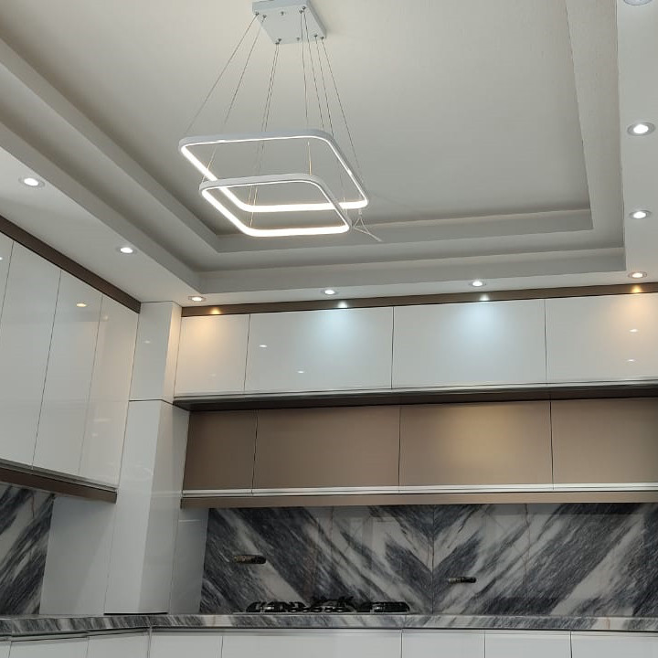 لوستر دو حلقه مربع به ابعاد 50-60 سانتیمتر ،رنگ بدنه سفید استاتیک ،در سه نوع (آفتابی ،مهتابی و چند رنگ) ارائه میشود ،از امکانات ریموت می توان کم و زیاد کردن نور ،حالت شب ،اپلیکیشن موبایل(کم و زیاد کردن نور ،تغییر طیف نوری ،تنظیم زمان برای خاموش یا روشن شدن ) ارائه میشود.