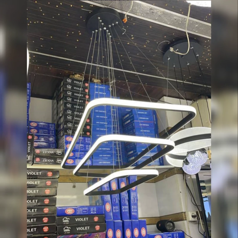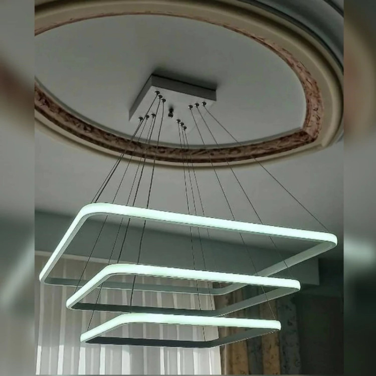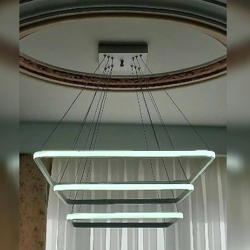 _لوستر مدرن مستطیل متشکل از 3 مستطیل 40×80، 30×60 و 20×40 _موجود در رنگ مشکی سوپرمات _دارای چهار حالت آفتابی،مهتابی،نچرال و حالت شب _قابل کنترل با ریموت کنترل و اپ موبایل _نور این لوستر به بیرون است که برخلاف نور داخل،پخش نور بالایی دارد. _آلومینیوم به کار رفته فابریک می باشد که در انتقال حرارت و در نتیجه عمر کار تاثیر زیادی دارد. _این محصول به طور مستقیم و بدون واسطه با بالاترین کیفیت و نازل ترین قیمت از تولیدی به دست شما میرسد. _ارتفاع این لوستر از 30 سانتی متر تا 1 متر قابل تنظیم است و با تغییر ارتفاع می توان طرح های مختلفی ساخت. _ریموت کنترل به همراه محصول ارسال می شود. _دارای گارانتی و خدمات پس از فروش