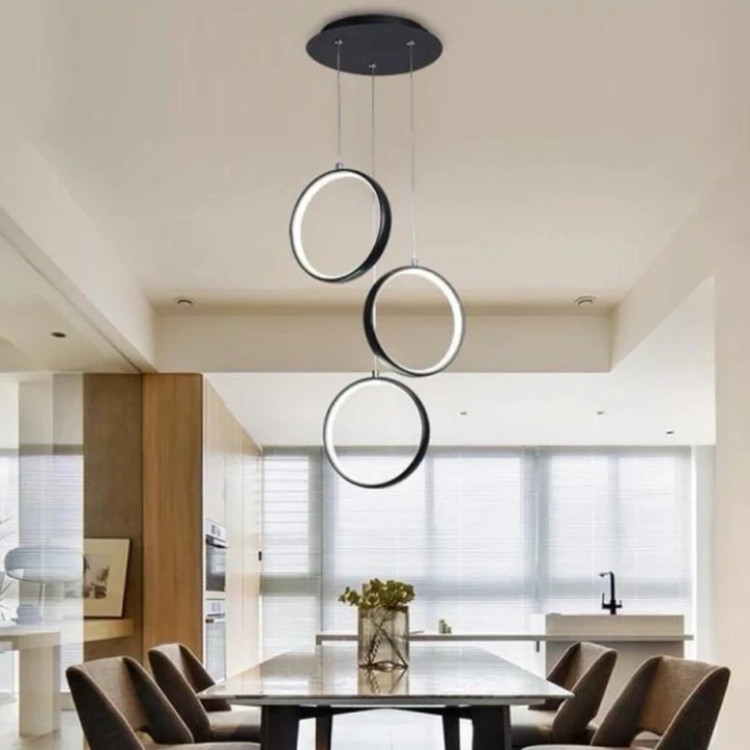 آویز گرد سه تایی تشکیل شده از 3 حلقه موجود در رنگ، مشکی دارای چهار حالت آفتابی ، مهتابی- آلومینیوم به کار رفته فابریک میباشد که در انتقال حرارت و در نتیجه عمر کار تاثیر زیادی دارد. - این محصول به طور مستقیم و بدون واسطه با بالاترین کیفیت و نازل ترین قیمت از تولیدی به دست شما میرسد. - ارتفاع این لوستر از 30 سانتی متر تا 1 متر قابل تنظیم است و با تغییر ارتفاع میتوان طرح های مختلفی ساخت. - دارای گارانتی و خدمات پس از فروش